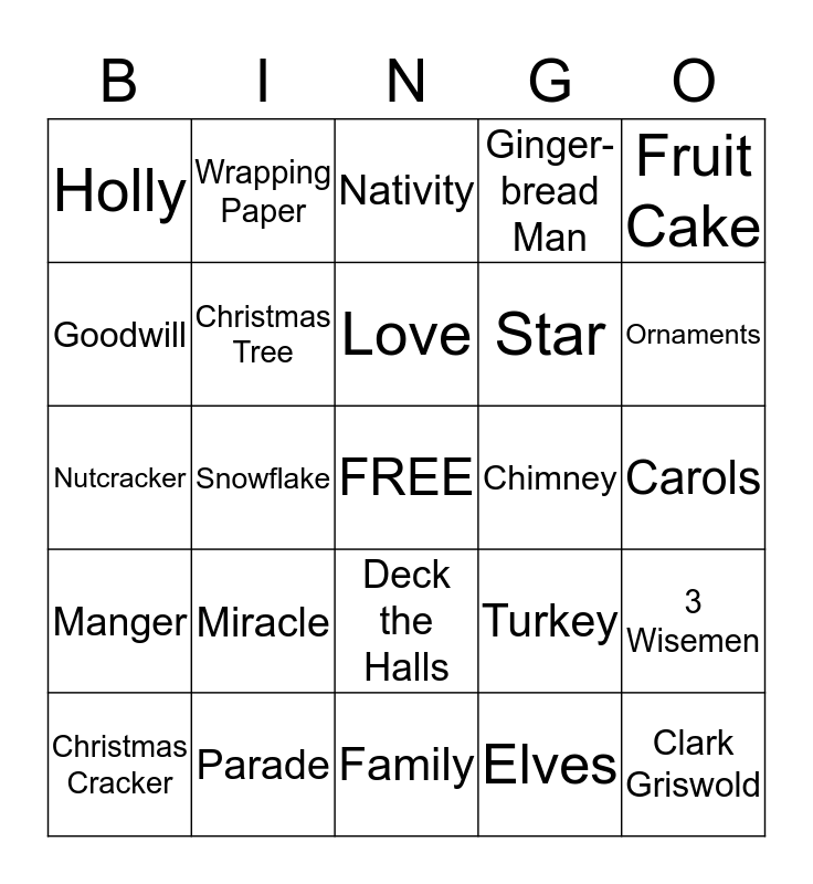This bingo card has a free space and 24 words: Miracle, Parade, Love, Christmas Cracker, Fruit Cake, Holly, Goodwill, Wrapping Paper, Chimney, Deck the Halls, Star, Nutcracker, Turkey, 3 Wisemen, Christmas Tree, Elves, Carols, Nativity, Ornaments, Snowflake, Clark Griswold, Manger, Ginger- bread Man and Family.
