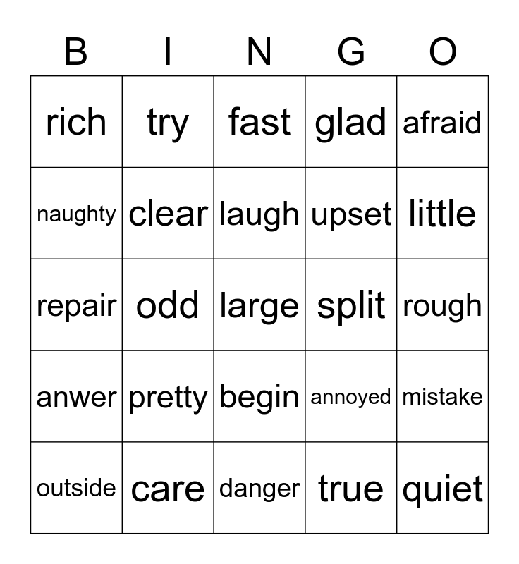 This bingo card has 25 words: pretty, danger, laugh, outside, afraid, rich, naughty, try, split, begin, upset, repair, annoyed, mistake, clear, quiet, rough, fast, little, odd, large, care, anwer, glad and true.