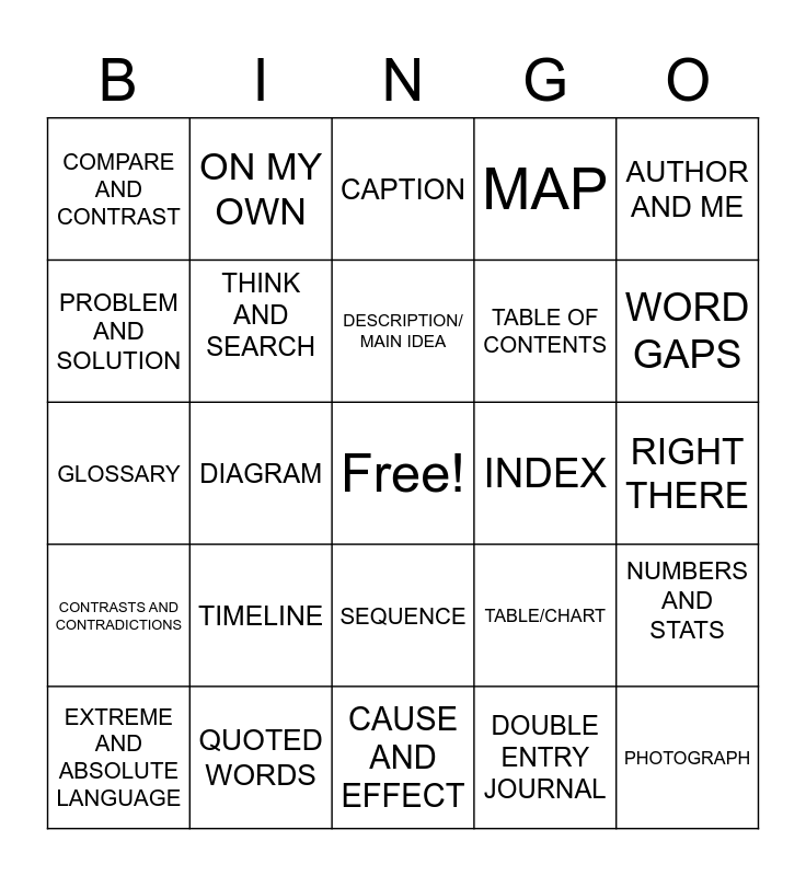 This bingo card has a free space and 24 words: TIMELINE, QUOTED WORDS, DESCRIPTION/ MAIN IDEA, EXTREME AND ABSOLUTE LANGUAGE, AUTHOR AND ME, COMPARE AND CONTRAST, PROBLEM AND SOLUTION, ON MY OWN, INDEX, SEQUENCE, TABLE OF CONTENTS, GLOSSARY, TABLE/CHART, NUMBERS AND STATS, THINK AND SEARCH, DOUBLE ENTRY JOURNAL, RIGHT THERE, CAPTION, WORD GAPS, DIAGRAM, PHOTOGRAPH, CONTRASTS AND CONTRADICTIONS, MAP and CAUSE AND EFFECT.