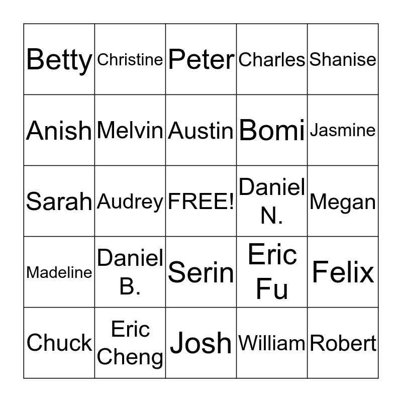 This bingo card has a free space and 24 words: Daniel B., Eric Cheng, Austin, Chuck, Shanise, Betty, Anish, Christine, Daniel N., Serin, Bomi, Sarah, Eric Fu, Felix, Melvin, William, Megan, Peter, Jasmine, Audrey, Robert, Madeline, Charles and Josh.