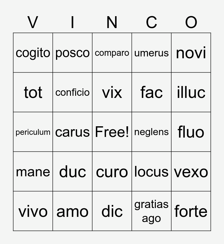 This bingo card has a free space and 30 words: amo, castigo, carus, dulcis, cogito, comparo, conficio, curo, neglens, dic, fluo, forte, gratias ago, hasta, illuc, iter, locus, mane, duc, novi, periculum, plurimi, posco, fac, tot, umerus, vexo, vivo, vix and vox.