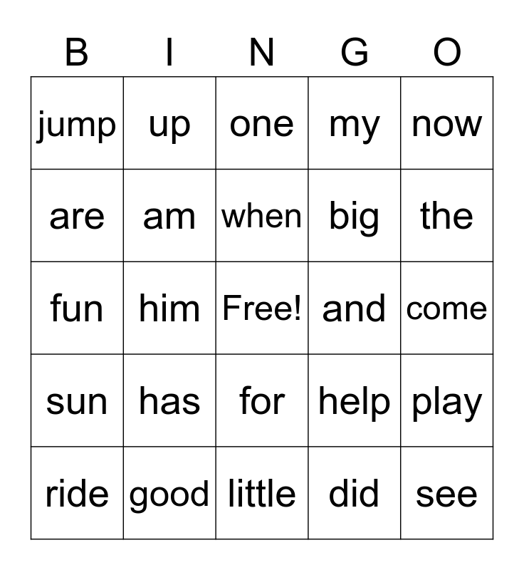 This bingo card has a free space and 24 words: ride, has, when, did, now, jump, up, one, and, come, fun, am, help, play, are, good, little, my, the, sun, him, for, big and see.