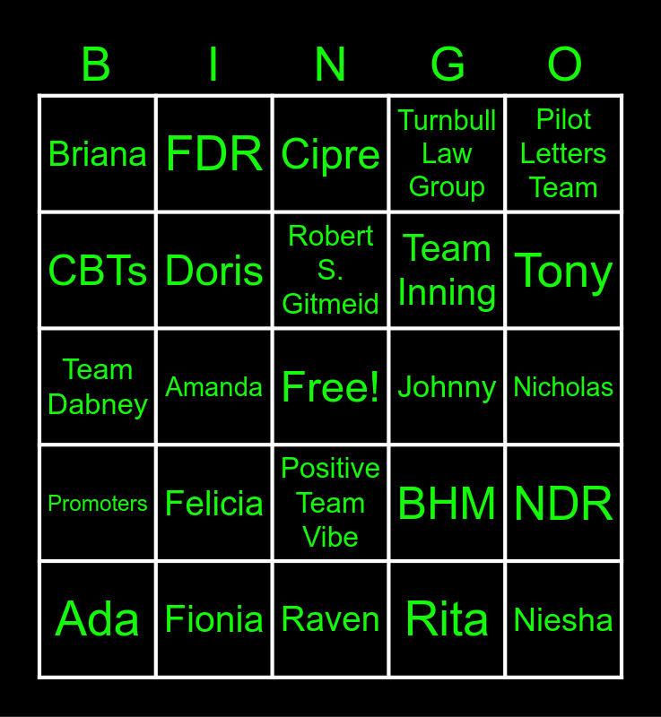 This bingo card has a free space and 29 words: Ada, Alake, Amanda, Ava, Briana, Cipre, Doris, Felicia, Johnny, Fionia, Nicholas, Niesha, Raven, Rita, Tony, Time Between Calls, Positive Team Vibe, Promoters, Pilot Letters Team, Team Dabney, BHM, 2021, Team Inning, CBTs, Turnbull Law Group, FDR, NDR, Robert S. Gitmeid and No ATC.