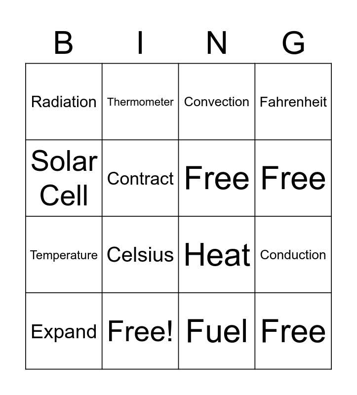 This bingo card has 16 words: Free!, Conduction, Convection, Radiation, Temperature, Thermometer, Heat, Fuel, Solar Cell, Contract, Expand, Fahrenheit, Celsius, Free, Free and Free.