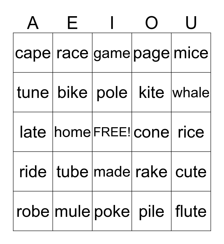 This bingo card has a free space and 27 words: rake, face, kite, poke, tune, game, race, ride, cone, cute, late, page, robe, mule, whale, cage, bike, pole, tube, cape, rice, pile, home, flute, made, mice and time.