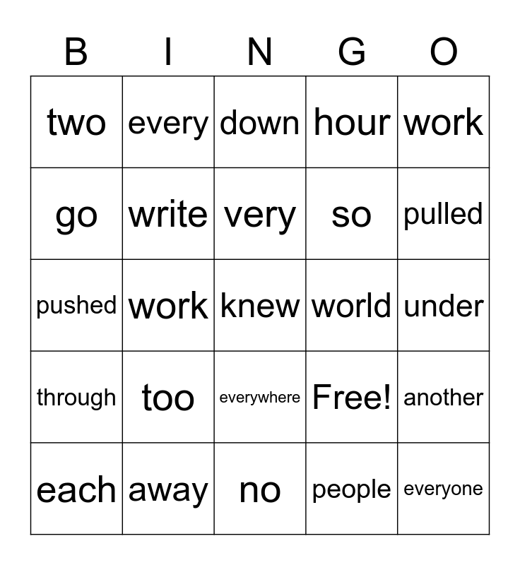 This bingo card has 25 words: too, no, very, each, work, two, go, every, world, everywhere, so, pushed, Free!, another, write, everyone, under, down, pulled, work, knew, away, through, hour and people.
