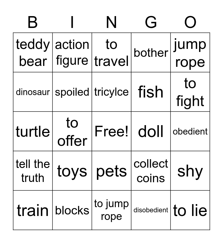 This bingo card has a free space and 24 words: toys, blocks, tricylce, train, jump rope, teddy bear, dinosaur, action figure, doll, pets, fish, turtle, collect coins, shy, spoiled, disobedient, obedient, to travel, to fight, to offer, to lie, tell the truth, bother and to jump rope.