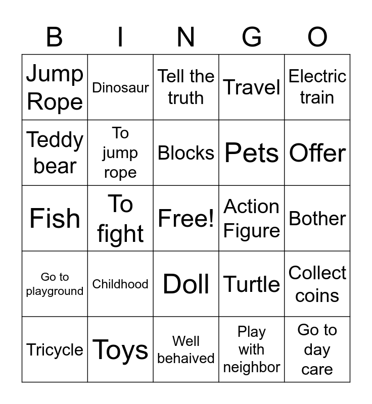 This bingo card has a free space and 24 words: Childhood, Toys, Blocks, Tricycle, Electric train, Jump Rope, Teddy bear, Dinosaur, Action Figure, Doll, Pets, Fish, Turtle, Collect coins, To jump rope, Play with neighbor, Bother, Tell the truth, Offer, To fight, Go to day care, Go to playground, Travel and Well behaived.