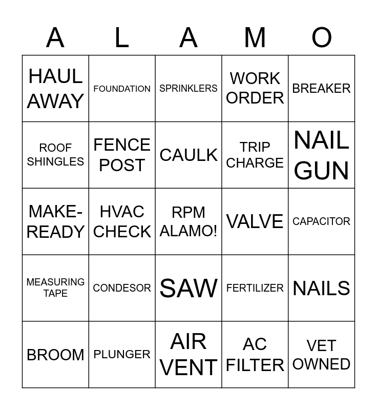 This bingo card has a free space and 59 words: BLINDS, PLUNGER, VACUUM, MEASURING TAPE, AC FILTER, PAINT, FENCE POST, LAWN MOWER, TRIP CHARGE, APPLIANCES, WORK ORDER, WATER SOFTENER, ROOF SHINGLES, TOILET, REKEY, HAUL AWAY, VET OWNED, BREAKER, MAINTENANCE, CAULK, VALVE, SPRINKLERS, BROOM, NAILS, HAMMER, LADDER, MOP, LOCKS, NAIL GUN, THERMOSTAT, WEED EATER, CARPET CLEANER, WATER HEATER, GLASS, FOUNDATION, POOL, WOOD, HVAC CHECK, LIGHT BULBS, MAKE-READY, GFCI, CONDESOR, CAPACITOR, COMPRESSOR, OUTLET, LIGHT SWITCH, DRAIN, FAUCET, SAW, AIR VENT, PEST CONTROL, CHAIN SAW, SOD, GUTTERS, WINDOW SCREENS, FERTILIZER, DOOR, SMOKE DETECTOR and GAS.