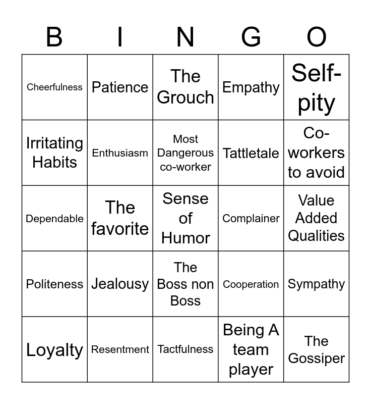 This bingo card has a free space and 24 words: Jealousy, Resentment, Most Dangerous co-worker, Loyalty, Self-pity, Cheerfulness, Irritating Habits, Patience, Complainer, The Boss non Boss, Tattletale, Dependable, Cooperation, Sympathy, Enthusiasm, Being A team player, Value Added Qualities, The Grouch, Co-workers to avoid, The favorite, The Gossiper, Politeness, Empathy and Tactfulness.