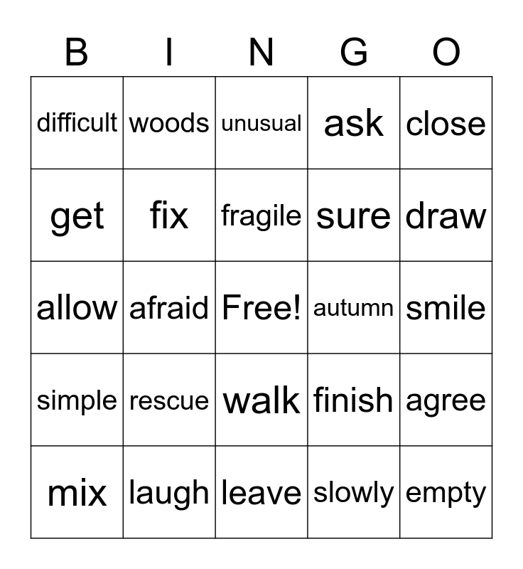 This bingo card has a free space and 29 words: mix, buy, afraid, chilly, difficult, unusual, fix, rescue, autumn, laugh, smile, empty, leave, slowly, draw, student, walk, simple, close, allow, finish, mistake, sure, get, ask, woods, agree, fragile and announced.