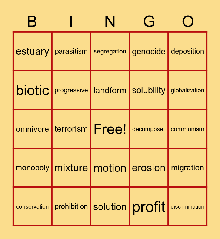 This bingo card has a free space and 25 words: mixture, solution, landform, conservation, deposition, estuary, biotic, parasitism, decomposer, motion, solubility, omnivore, erosion, migration, progressive, revolution, communism, segregation, globalization, terrorism, discrimination, prohibition, monopoly, genocide and profit.