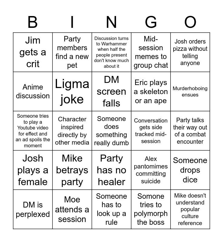 This bingo card has a free space and 24 words: Mike betrays party, Moe attends a session, DM screen falls, DM is perplexed, Josh orders pizza without telling anyone, Jim gets a crit, Anime discussion, Party members find a new pet, Conversation gets side tracked mid-session, Party has no healer, Eric plays a skeleton or an ape, Someone tries to play a Youtube video for effect and an ad spoils the moment, Alex pantomimes committing suicide, Someone drops dice, Ligma joke, Somone tries to polymorph the boss, Party talks their way out of a combat encounter, Discussion turns to Warhammer when half the people present don't know much about it, Murderhoboing ensues, Character inspired directly by other media, Mike doesn't understand popular culture reference, Josh plays a female, Mid-session memes to group chat and Someone has to look up a rule.