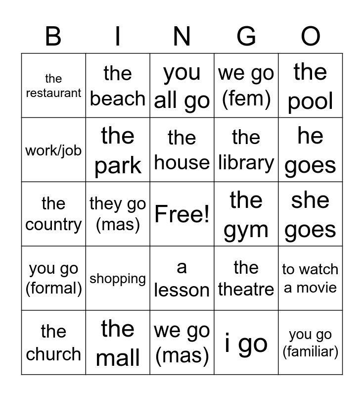 This bingo card has a free space and 24 words: shopping, the mall, the house, the church, the pool, the restaurant, work/job, the beach, the gym, a lesson, the library, the country, the theatre, to watch a movie, the park, i go, she goes, you all go, he goes, they go (mas), you go (familiar), you go (formal), we go (fem) and we go (mas).