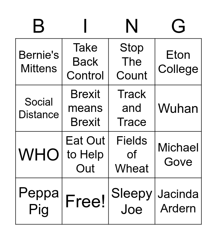 This bingo card has 27 words: Blue Passports, Jackie Weaver, WHO, Pfizer, Brexit means Brexit, Stop The Count, Take Back Control, Jacinda Ardern, Free!, Drain the Swamp, Fields of Wheat, Eton College, Hard Border, £350 million, Eat Out to Help Out, Barnard Castle, Track and Trace, Wuhan, Terrorist Sympathisers, Bernie's Mittens, Sleepy Joe, The Coup, Michael Gove, Peppa Pig, Controlled and Limited, Social Distance and Happier in Britain.