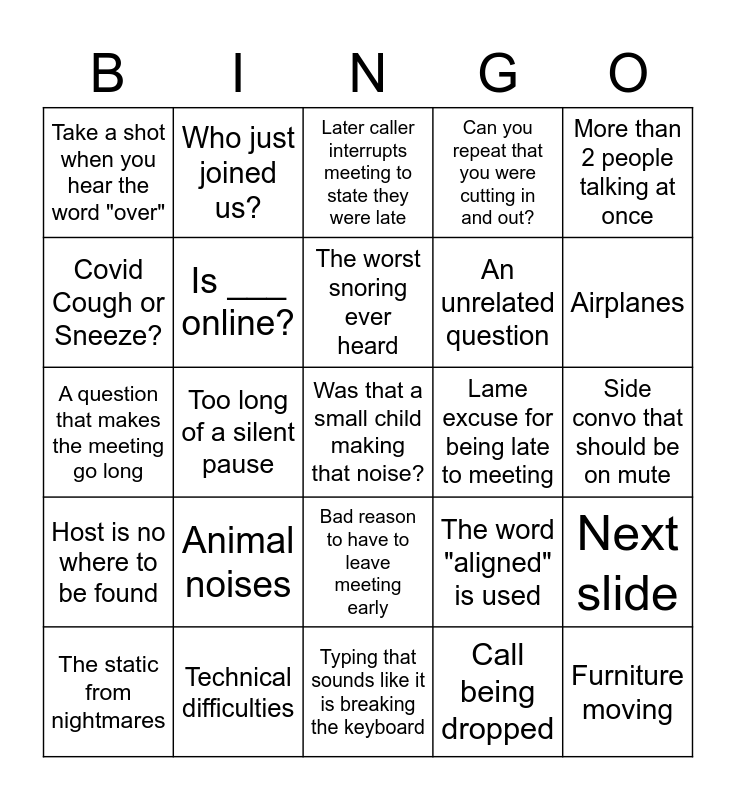 This bingo card has 25 words: Animal noises, Typing that sounds like it is breaking the keyboard, The worst snoring ever heard, The static from nightmares, More than 2 people talking at once, Take a shot when you hear the word "over", Covid Cough or Sneeze?, Who just joined us?, Lame excuse for being late to meeting, Bad reason to have to leave meeting early, An unrelated question, A question that makes the meeting go long, The word "aligned" is used, Next slide, Is ___ online?, Furniture moving, Side convo that should be on mute, Later caller interrupts meeting to state they were late, Airplanes, Too long of a silent pause, Was that a small child making that noise?, Technical difficulties, Host is no where to be found, Can you repeat that you were cutting in and out? and Call being dropped.