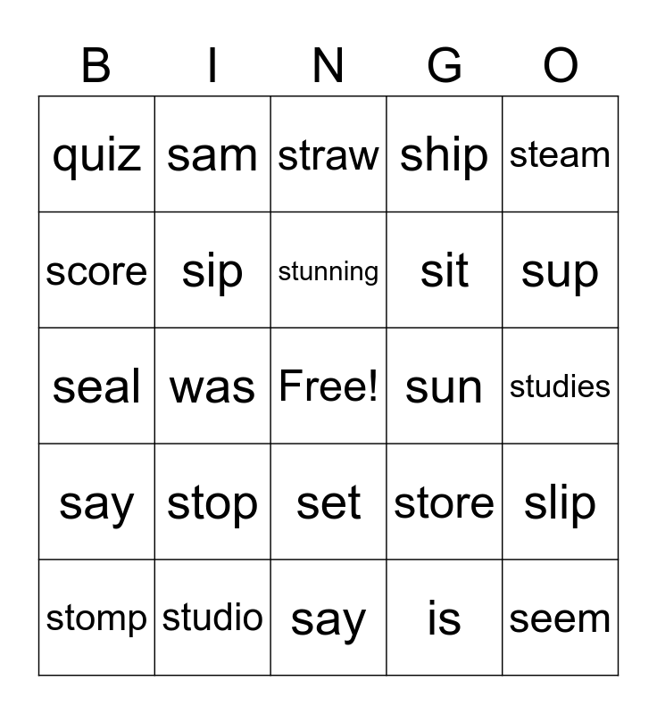 This bingo card has a free space and 49 words: steam, seem, stay, say, stop, soothe, sam, sore, score, sign, sip, ship, slip, store, stoop, sack, stunning, sun, stun, steam, was, is, quiz, sit, sick, sup, stomp, sew, set, say, safe, sad, starbucks, stink, studio, student, score, study, studies, snack, steak, saver, stork, steal, seal, straw, strawberry, sales and sip.
