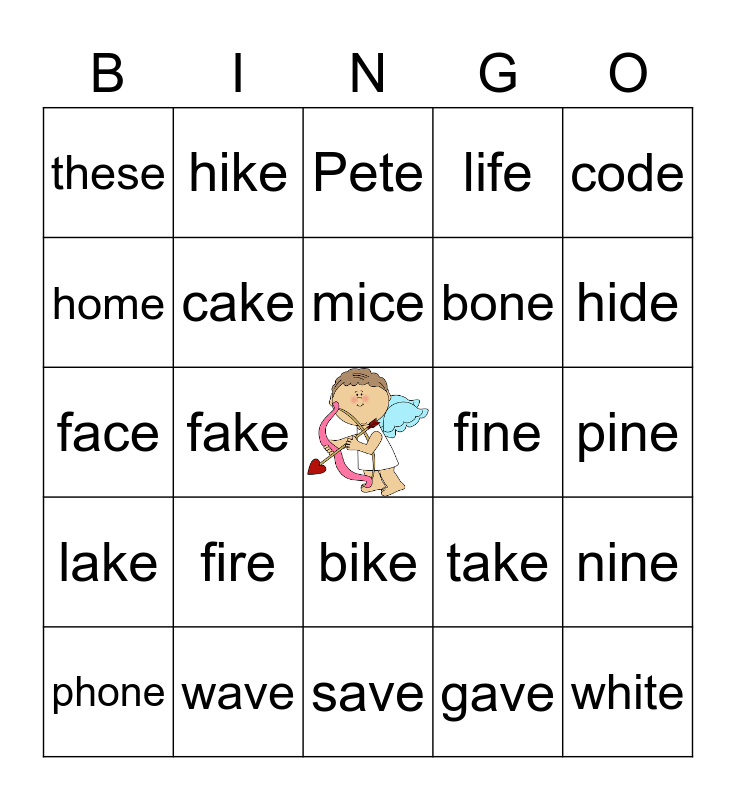 This bingo card has a free space and 29 words: phone, made, fake, care, these, Pete, cake, fire, fine, wave, pine, white, save, gave, hide, joke, bike, lake, code, face, take, game, bone, home, life, hike, nine, mice and make.