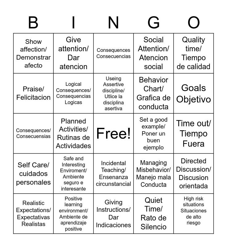 This bingo card has a free space and 24 words: Safe and Interesting Enviroment/ Ambiente seguro e interesante, Positive learning environment/ Ambiente de aprendizaje positive, Useing Assertive discipline/ Utlice la disciplina asertiva, Realistic Expectations/ Expectativas Realistas, Quality time/ Tiempo de calidad, Show affection/ Demonstrar afecto, Praise/ Felicitacion, Give attention/ Dar atencion, Set a good example/ Poner un buen ejemplo, Incidental Teaching/ Ensenanza circunstancial, Behavior Chart/ Grafica de conducta, Consequences/ Consecuensias, Managing Misbehavior/ Manejo mala Conducta, Directed Discussion/ Discusion orientada, Logical Consequences/ Consequencias Logicas, Quiet Time/ Rato de Silencio, Time out/ Tiempo Fuera, Consequences Consecuencias, Goals Objetivo, Planned Activities/ Rutinas de Actividades, High risk situations Situaciones de alto riesgo, Self Care/ cuidados personales, Social Attention/ Atencion social and Giving Instructions/ Dar Indicaciones.
