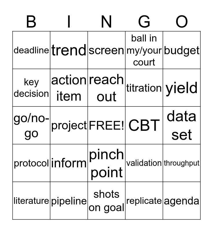 This bingo card has a free space and 35 words: robust, red-flag, touch-base, action item, pinch point, ball in my/your court, key decision, follow-up, reach out, timeline, go/no-go, budget, leadership, buy-in, deadline, CBT, replicate, project, protocol, agenda, validation, literature, throughput, pipeline, screen, yield, coffee, positive control, titration, data set, results, shots on goal, inform, trend and ensure.
