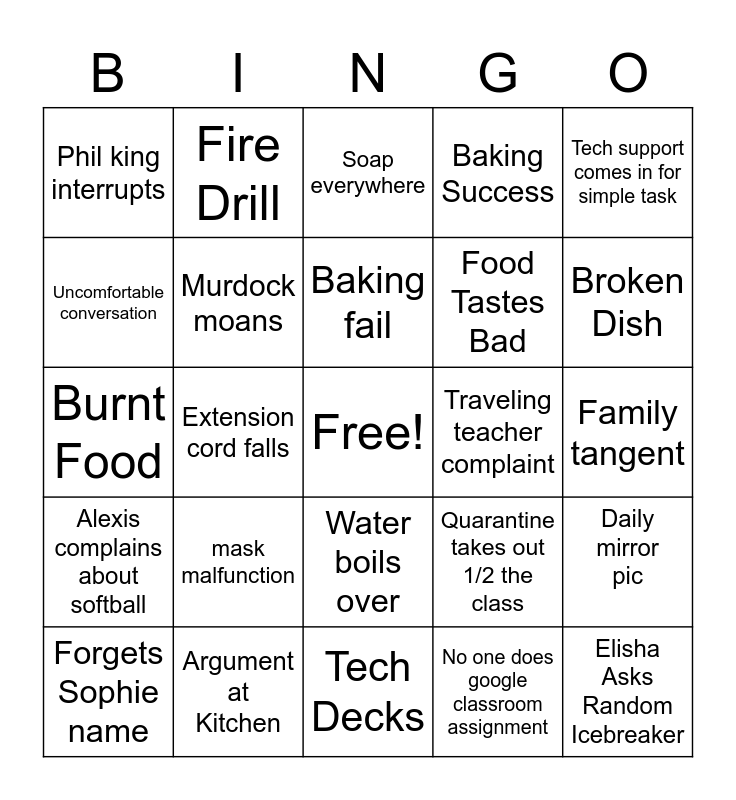 This bingo card has a free space and 37 words: Loss of motivation, Tech Fail, Something breaks, Murdock moans, Daily mirror pic, mask malfunction, Baking fail, Aiden catchphrases, Tech support comes in for simple task, Sophie mentions boyfriend, Extension cord falls, Baking Success, Elisha Asks Random Icebreaker, Family tangent, Uncomfortable conversation, Alexis complains about softball, Phone rings, Soap everywhere, Water boils over, Traveling teacher complaint, Phil king interrupts, Broken Dish, Forgets Sophie name, Tech Decks, Word Search, No one does google classroom assignment, Fire Drill, Lockdown Button Hit, Power Outage, Crickets Phone Sound, WiFi Goes Out, Argument at Kitchen, Burnt Food, Wrong ingredient, Quarantine takes out 1/2 the class, Food Tastes Bad and Yells at Jake for not wearing mask.
