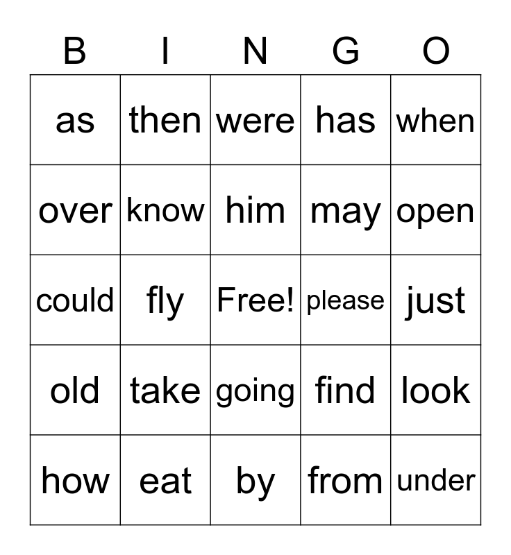 This bingo card has a free space and 24 words: take, eat, him, how, when, as, over, then, please, going, may, could, find, look, know, from, just, were, open, fly, under, old, has and by.