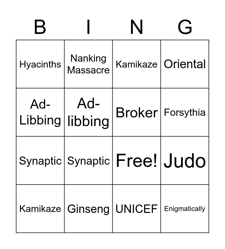 This bingo card has 21 words: Ginseng, Scalpel, Nanking Massacre, Judo, UNICEF, Broker, Hyacinths, Kamikaze, Free!, Forsythia, Synaptic, Oriental, Enigmatically, Aplomb, Ad-libbing, Bar/Bas Mitzvahs, Kamikaze, Synaptic, Ad-Libbing, Judo and Nanking Massacre.