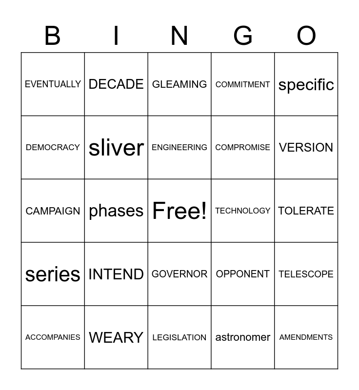 This bingo card has a free space and 32 words: astronomer, crescent, phases, rotates, series, sliver, specific, TELESCOPE, DECADE, DIRECTING, ENGINEERING, GLEAMING, SCOUTED, SQUIRMED, TECHNOLOGY, TINKERING, ACCOMPANIES, CAMPAIGN, GOVERNOR, INTEND, OPPONENT, OVERWHELMING, TOLERATE, WEARY, AMENDMENTS, COMMITMENT, COMPROMISE, DEMOCRACY, EVENTUALLY, LEGISLATION, PRIVILEGE and VERSION.