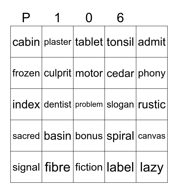 This bingo card has a free space and 24 words: basin, fibre, motor, signal, admit, cabin, frozen, plaster, slogan, bonus, cedar, index, spiral, canvas, culprit, label, rustic, tablet, phony, dentist, lazy, sacred, tonsil and fiction.