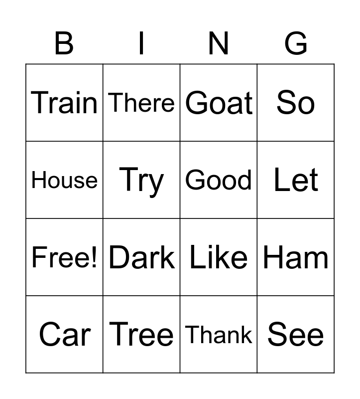 This bingo card has 20 words: Ham, May, Goat, Box, Car, House, Tree, Train, Free!, There, Dark, Like, Try, See, Good, Not, Let, So, Thank and You.