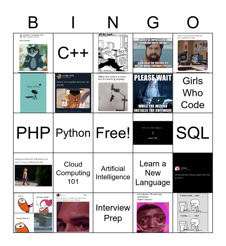 This bingo card has 30 images, a free space and 29 words: Girls Who Code, Imposter Syndrome, Java, JavaScript, C++, Rubber Duck, HTML/CSS, Python, Application Party, PHP, Ruby, Cloud Computing 101, SQL, Intro to Blockchain, Social Justice in Tech, Movie Nights, Among Us Game Night, Virtual Hackathon, Artificial Intelligence, Interview Prep, Career Panels, Craft Nights, App Building, How to Code a Website, Open Source, Learn a New Language, Math/CS Major Exploration, Prototyping 101 and Study Groups.