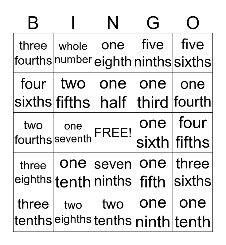 This bingo card has a free space and 24 words: one tenth, two eighths, one half, three tenths, five sixths, three fourths, four sixths, whole number, one sixth, seven ninths, one third, two fourths, one fifth, three sixths, two fifths, one ninth, four fifths, one eighth, one fourth, one seventh, one tenth, three eighths, five ninths and two tenths.