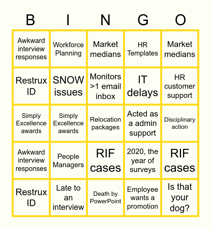 This bingo card has 150 words: Acted as IT support, Complaints about dress code, Spent hours submitting tickets, Monitors >1 email inbox, Payroll error, Process changes, New vendor, Mediating arguments, Tough conversations, Disciplinary action, Onboarding delays, Broken laptops, IT delays, Offboarding issues, SNOW issues, Holiday approvals, LAN ID, Exit interviews, Can’t find the SAP info you need, What’s Visier again?, Sorry, what is Slack?, You’re on mute, Employee conflicts, Oh that’s a nice background!, You’re frozen, Awww you’re children are cute, Is that your dog?, Acted as a admin support, HR customer support, Recruitment delays, Employee wants a promotion, Employee salary/merit increase, Insurance claims, Concur issues, Payslip error, Tax issues, International transfers, Employee visas, Relocation packages, Delayed flights, DE&I requests, BRG meetings, Market medians, Internal medians, C&B data conflicts, Bad first interviews, Asking TA for more CVs, Creating employee handbook, Awkward interview responses, Late to an interview, ‘Emotional’ employees, RIF cases, Simply Excellence awards, SIP rollout, SIP changes, Harassment cases, Security breaches, Integrity/ethics cases, eLearning, Inputting goals, Mentoring, People Managers, Restrux ID, Campus hiring, BTL/ATL, HR Templates, Workforce Planning, NDPT, IDM Team, Death by PowerPoint, 2020, the year of surveys, COVID-19, Sanitisation protocol, WFH, Return to work meeting, Acted as IT support, Complaints about dress code, Spent hours submitting tickets, Monitors >1 email inbox, Payroll error, Process changes, New vendor, Mediating arguments, Tough conversations, Disciplinary action, Onboarding delays, Broken laptops, IT delays, Offboarding issues, SNOW issues, Holiday approvals, LAN ID, Exit interviews, Can’t find the SAP info you need, What’s Visier again?, Sorry, what is Slack?, You’re on mute, Employee conflicts, Oh that’s a nice background!, You’re frozen, Awww your children are cute, Is that your dog?, Acted as a admin support, HR customer support, Recruitment delays, Employee wants a promotion, Employee salary/merit increase, Insurance claims, Concur issues, Payslip error, Tax issues, International transfers, Employee visas, Relocation packages, Delayed flights, DE&I requests, BRG meetings, Market medians, Internal medians, C&B data conflicts, Bad first interviews, Asking TA for more CVs, Creating employee handbook, Awkward interview responses, Late to an interview, ‘Emotional’ employees, RIF cases, Simply Excellence awards, SIP rollout, SIP changes, Harassment cases, Security breaches, Integrity/ethics cases, eLearning, Inputting goals, Mentoring, People Managers, Restrux ID, Campus hiring, BTL/ATL, HR Templates, Workforce Planning, NDPT, IDM Team, Death by PowerPoint, 2020, the year of surveys, COVID-19, Sanitisation protocol, WFH and Return to work meeting.