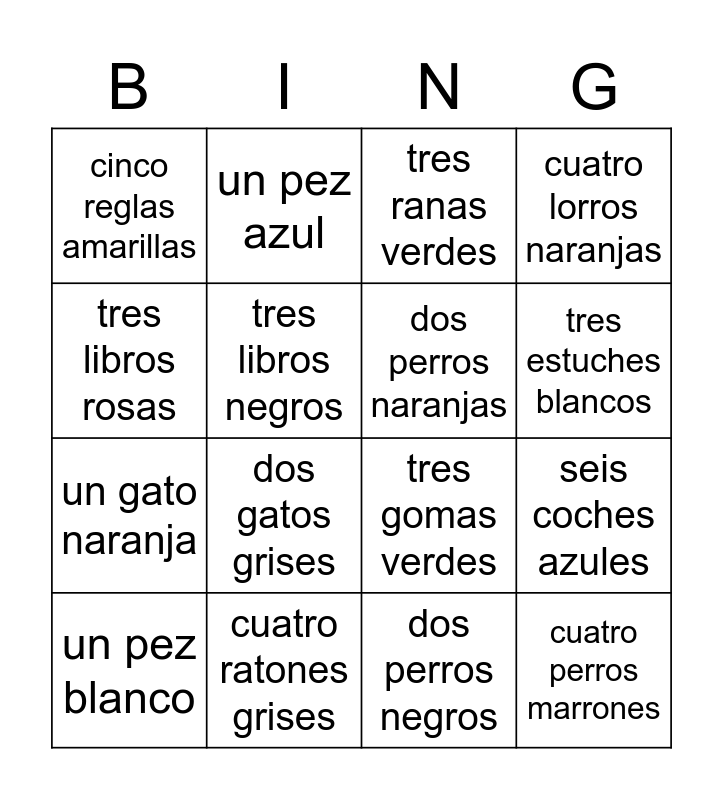 This bingo card has 21 words: cuatro ratones grises, dos gatos blancos, un pez azul, un coche violeta, dos perros negros, dos perros naranjas, cinco reglas amarillas, tres ranas verdes, tres gomas verdes, tres estuches blancos, un gato naranja, cuatro lorros naranjas, cuatro perros marrones, dos mochilas rojas, tres libros negros, tres mochilas negras, un pez blanco, dos gatos grises, tres libros rosas, seis coches azules and dos ratones blancos.