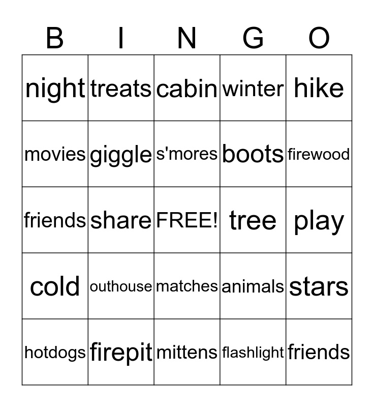 This bingo card has a free space and 24 words: outhouse, firepit, s'mores, hotdogs, hike, night, movies, treats, tree, matches, boots, friends, animals, stars, giggle, flashlight, play, cabin, firewood, share, friends, cold, winter and mittens.