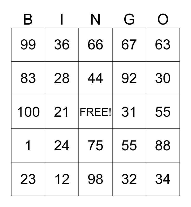 This bingo card has a free space and 24 words: 24, 12, 44, 23, 63, 99, 83, 36, 31, 75, 92, 100, 55, 88, 28, 32, 55, 66, 30, 21, 34, 1, 67 and 98.
