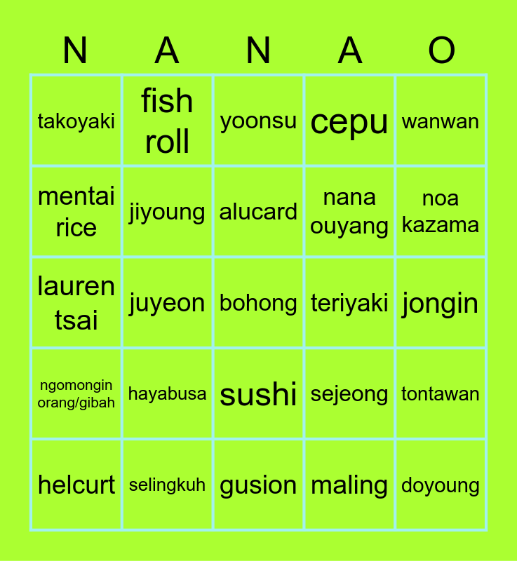 This bingo card has 25 words: hayabusa, gusion, alucard, helcurt, wanwan, takoyaki, mentai rice, fish roll, teriyaki, sushi, nana ouyang, lauren tsai, sejeong, tontawan, jiyoung, doyoung, jongin, yoonsu, noa kazama, juyeon, bohong, selingkuh, ngomongin orang/gibah, cepu and maling.