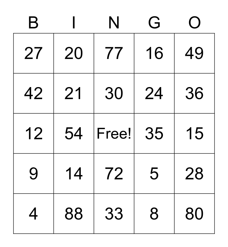 This bingo card has a free space and 29 words: 4, 64, 54, 18, 27, 77, 21, 14, 35, 88, 15, 80, 33, 8, 36, 30, 72, 9, 49, 12, 5, 48, 24, 42, 16, 20, 28, 30 and 25.