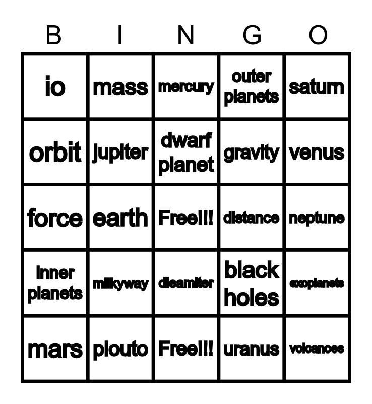 This bingo card has a free space and 24 words: milkyway, plouto, dwarf planet, mars, saturn, io, orbit, mass, distance, dieamiter, gravity, force, black holes, exoplanets, jupiter, uranus, neptune, mercury, venus, earth, volcanoes, inner planets, outer planets and Free!!!.