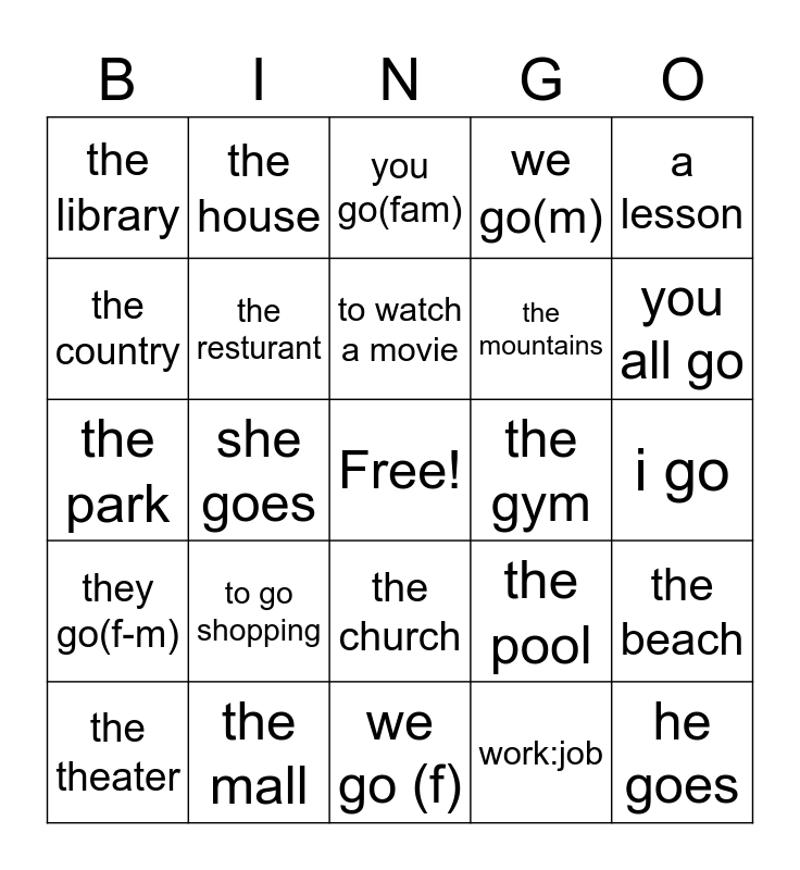This bingo card has a free space and 24 words: to go shopping, the mall, to watch a movie, the theater, a lesson, the library, the country, the house, the gym, the church, the mountains, the park, the pool, the beach, the resturant, work:job, i go, you go(fam), you all go, she goes, he goes, they go(f-m), we go(m) and we go (f).