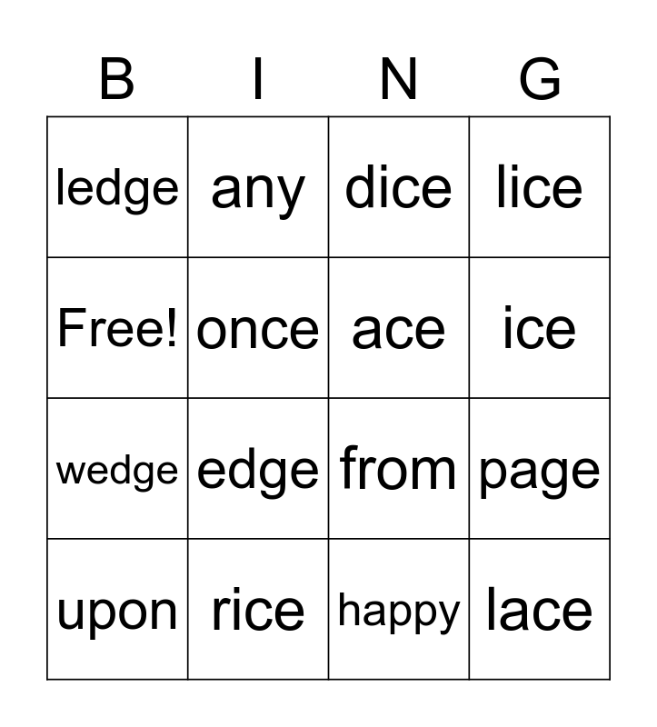 This bingo card has 16 words: rice, page, dice, ledge, wedge, any, from, happy, Free!, once, upon, lice, edge, ice, ace and lace.