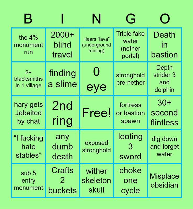 This bingo card has a free space and 39 words: mic muted, spot fortnite kid (baby zombie), fastion but stables, finding a slime, sub 5 entry monument, exposed stronghold, 0 eye, 4+ eyes, Death in bastion, “I fucking hate stables”, 2nd ring, Triple fake water (nether portal), Misplace obsidian, 30+ second flintless, fortress or bastion spawn, any dumb death, less than 400 blind, the 4% monument run, magma ravine scam, looting 3 sword, 2+ blacksmiths in 1 village, wither skeleton skull, stronghold pre-nether, Depth strider 3 and dolphin, Accidently sets it to peaceful, Misses parkour due to “quake pro”, 2 eye of Ender breakage, Jukebox%, 0 iron shipwreck, 2000+ blind travel, Pb pace lost to blind travel, Sub 3 entry, Hears “lava” (underground mining), Crafts 2 buckets, choke one cycle, axe/pick breaks during run, dig down and forget water, hary gets Jebaited by chat and dies in the End.