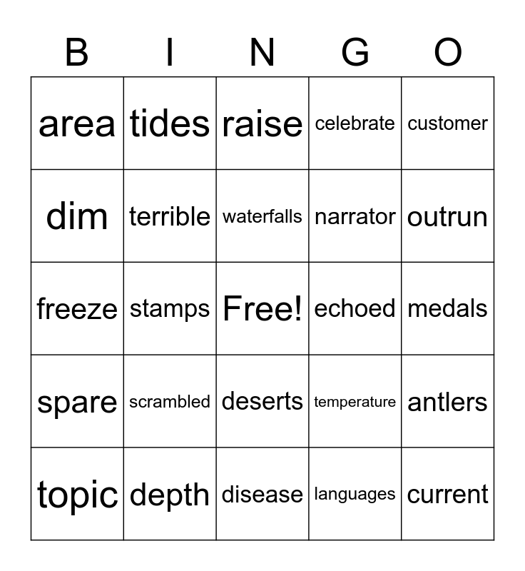This bingo card has a free space and 40 words: basketball, freeze, sports, terrible, depth, deserts, waterfalls, attic, customer, spare, stamps, celebrate, current, medals, echoed, scrambled, valley, area, proof, raise, antlers, languages, narrator, dim, gigantic, shine, bay, blizzards, supplies, noble, survivors, topic, grapevine, temperature, outrun, disease, incredible, ladle, tides and gully.