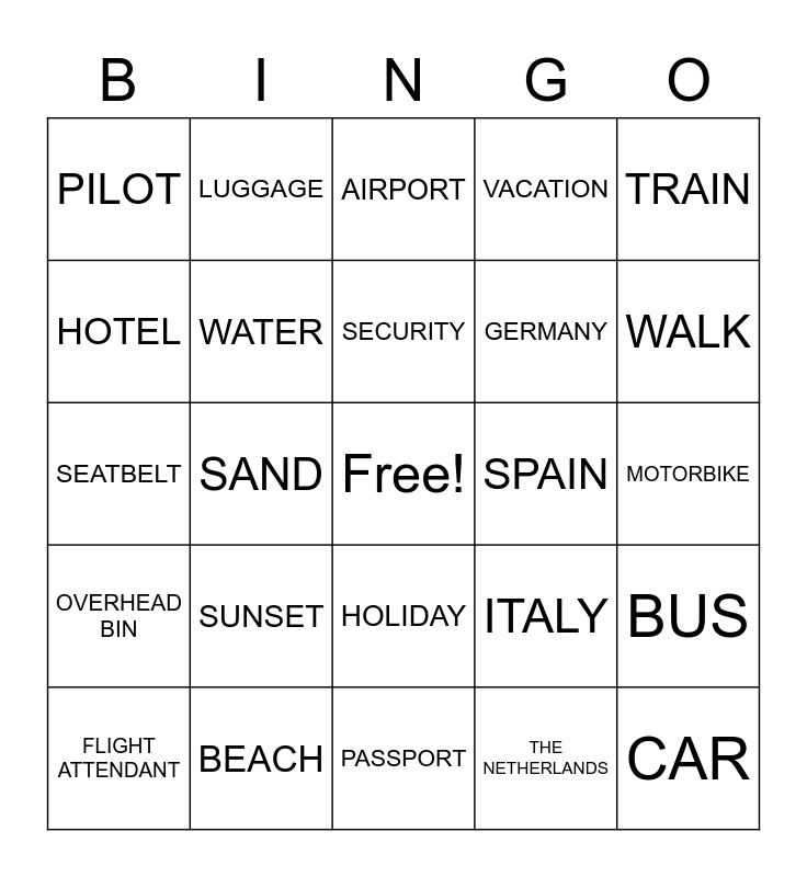 This bingo card has a free space and 29 words: AIRPLANE, BEACH, AIRPORT, EUROPE, TRAIN, PILOT, WATER, SECURITY, SPAIN, BUS, FLIGHT ATTENDANT, SAND, THE NETHERLANDS, CAR, SEATBELT, PALM TREES, PASSPORT, ITALY, WALK, OVERHEAD BIN, SUNSET, TICKET, GERMANY, MOTORBIKE, HOTEL, LUGGAGE, HOLIDAY, VACATION and RELAX.