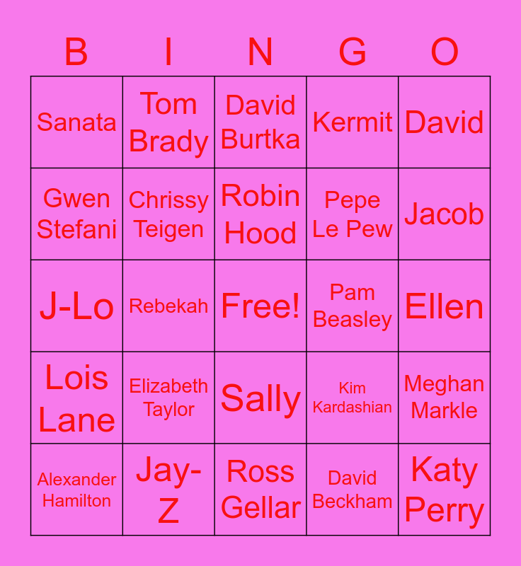 This bingo card has a free space and 24 words: Elizabeth Taylor, Jay-Z, Robin Hood, Alexander Hamilton, David, Sanata, Gwen Stefani, Tom Brady, Pam Beasley, Sally, Pepe Le Pew, J-Lo, Kim Kardashian, Meghan Markle, Chrissy Teigen, David Beckham, Ellen, David Burtka, Jacob, Rebekah, Katy Perry, Lois Lane, Kermit and Ross Gellar.