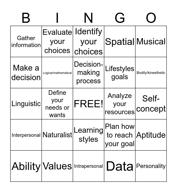 This bingo card has a free space and 24 words: Naturalist, Values, Decision-making process, Ability, Musical, Gather information, Make a decision, Evaluate your choices, Analyze your resources, Learning styles, Lifestyles goals, Linguistic, Plan how to reach your goal, Aptitude, Logical/mathematical, Data, Self-concept, Identify your choices, Bodily/kinesthetic, Define your needs or wants, Personality, Interpersonal, Spatial and Intrapersonal.