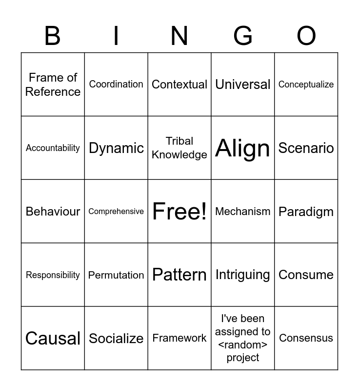This bingo card has a free space and 29 words: Causal, Externalize, Comprehensive, Dissonance, Frame of Reference, Contextual, Dynamic, Permutation, Mechanism, Socialize, Paradigm, Consensus, Framework, I've been assigned to <random> project, Scenario, Overarching, Pattern, Responsibility, Conceptualize, Behaviour, Intriguing, Principles, Align, Accountability, Universal, Coordination, Consume, Tribal Knowledge and Imperative.