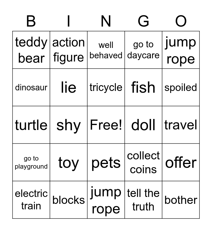 This bingo card has a free space and 24 words: toy, blocks, tricycle, electric train, jump rope, teddy bear, dinosaur, action figure, doll, pets, fish, turtle, collect coins, offer, lie, tell the truth, travel, well behaved, spoiled, shy, bother, go to playground, go to daycare and jump rope.