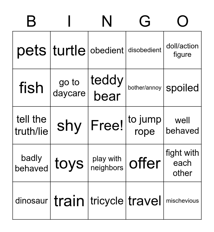 This bingo card has a free space and 24 words: toys, train, teddy bear, dinosaur, doll/action figure, pets, fish, turtle, to jump rope, play with neighbors, bother/annoy, tell the truth/lie, offer, fight with each other, go to daycare, travel, well behaved, obedient, spoiled, shy, mischevious, badly behaved, disobedient and tricycle.