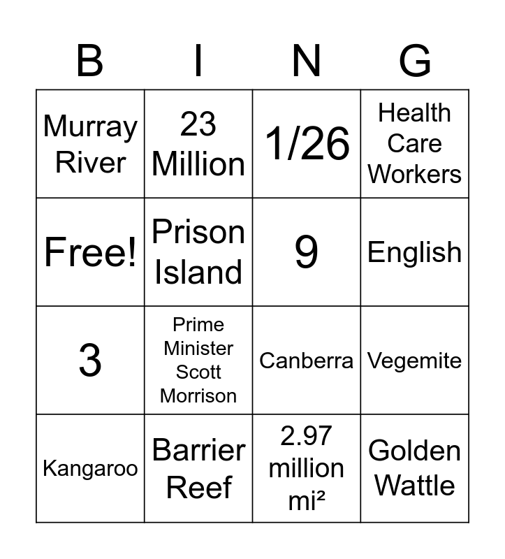 This bingo card has 16 words: Barrier Reef, Vegemite, 1/26, Murray River, 3, 23 Million, Canberra, 2.97 million mi², Free!, Prison Island, Kangaroo, Health Care Workers, Prime Minister Scott Morrison, English, 9 and Golden Wattle.